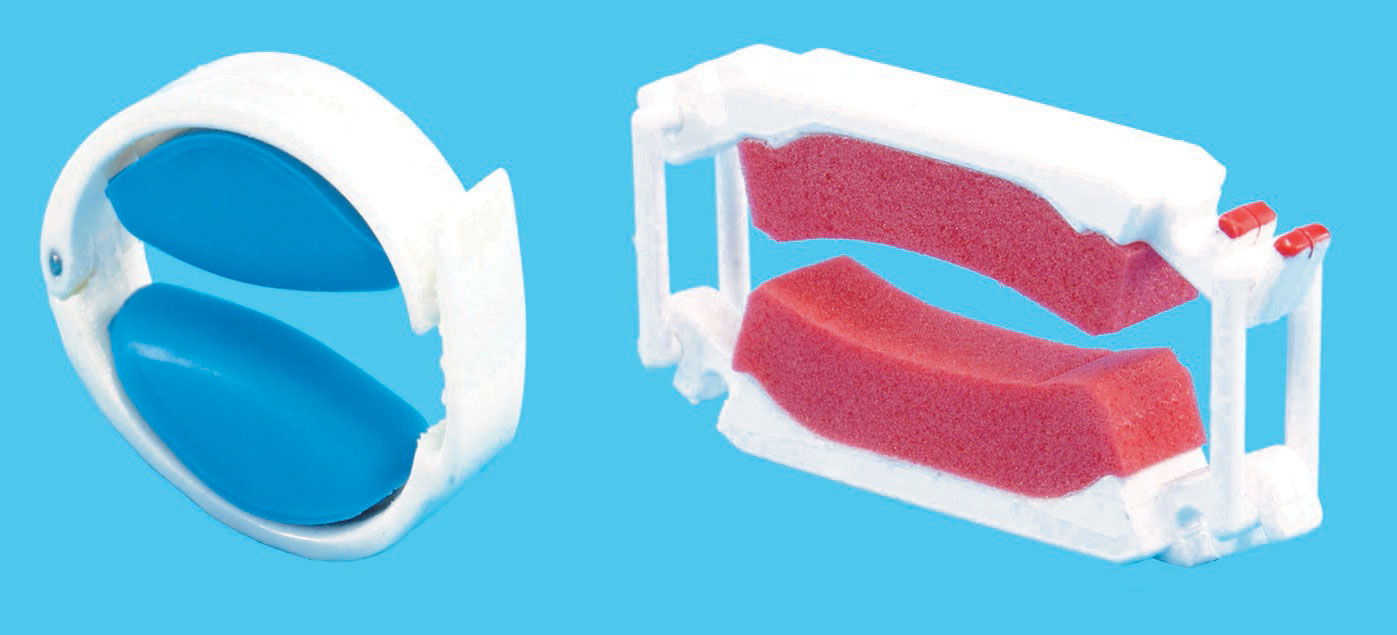 These are often referred to as male mechanical devices or penile clamps, and are the only device discussed here which may not be available on prescription. They are small reusable devices in different designs and are available via different manufacturers. They are designed to prevent urine leakage by compressing the penile urethra (Figure 5).They should be fitted to the middle or base of the penis. While many are adjustable, others are available in different sizes. It may take some trial and error to get the correct fitting device. Penile clamps are more likely to suit men who do not want to wear a sheath or pad product, have sufficient length of penis to attach device, wish to prevent leakage for a specific period, i.e. exercise, swimming etc, and who suffer with mainly stress urinary incontinence and feel that preventing leakage is more important than containment (Continence product advisor, 2020). However, these devices are less likely to suit individuals if their leakage is associated with urgency, they have poor memory or mental function, poor dexterity, skin prone to damage and no bladder sensation to void (Continence product advisor, 2020).