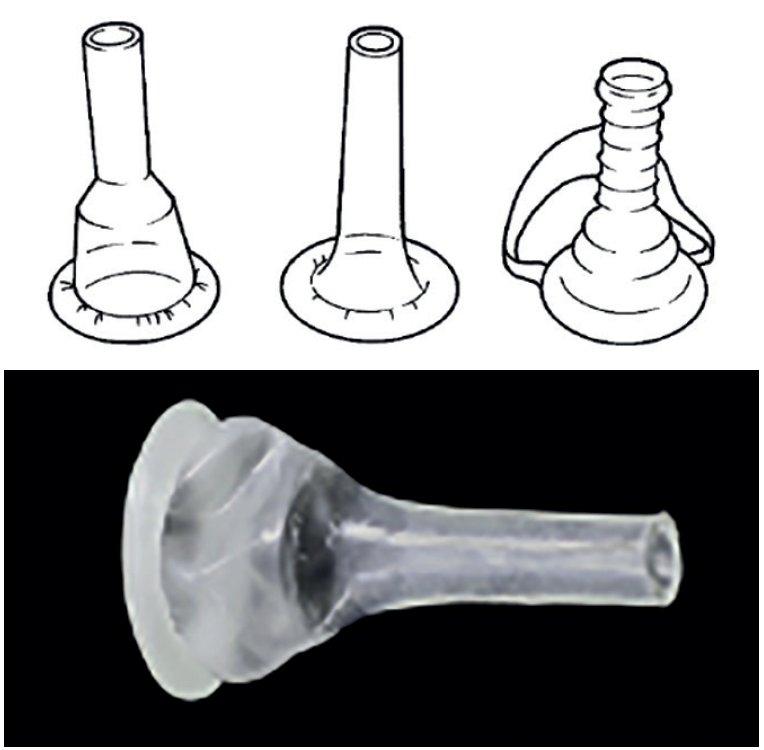 These are made from latex and are washable/reusable. They consist of a pressure ring (or doughnut), which is held in place by straps or underwear. The ring applies pressure to the pubic area and helps the penis to protrude into the cone device (Figure 3).These are suitable for men who have: