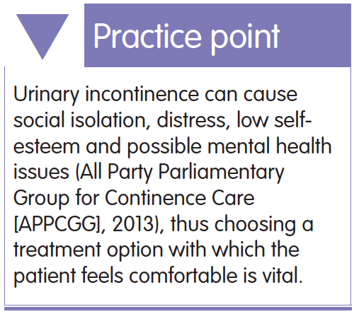 National Institute for Health and Care Excellence (2015) Urinary incontinence: the management of urinary incontinence in women. NICE, London. Available online: www.nice.org.uk/guidance/qs77